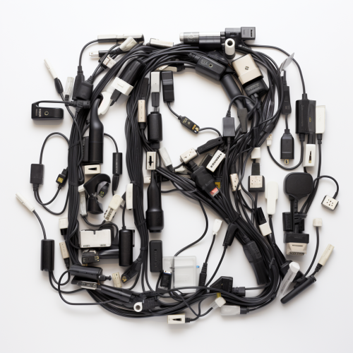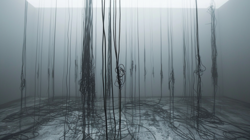 Lots and lots of dark gray rigid metal wires, densely with wires, hanging wires, wires hanging limp across from left to right, in a room that has light gray blank walls, photographic --ar 16:9 --no window, door, server, furniture, knots, bundles
