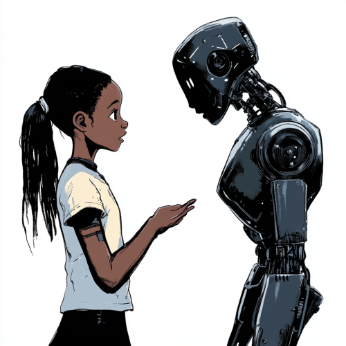 a black human girl talking to a robot, pixar, clean lines, vector, stark white background, do not include shadows, sharp contrast between characters and background