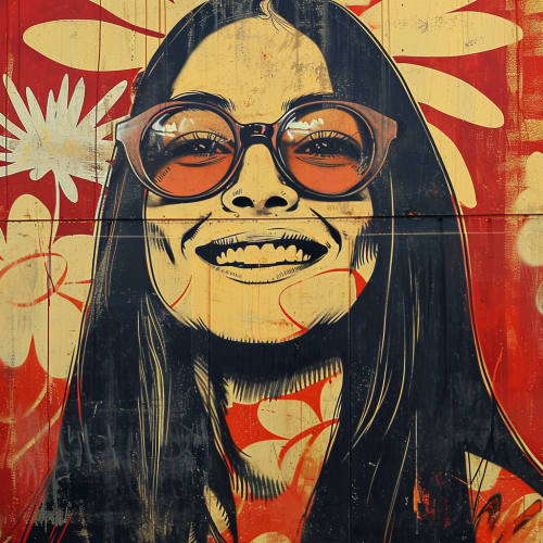 Graffiti a beautiful woman in her 50's with long black straight hair, small round glasses, a long face, and a big smile, style Shepard Fairey --v 6.0