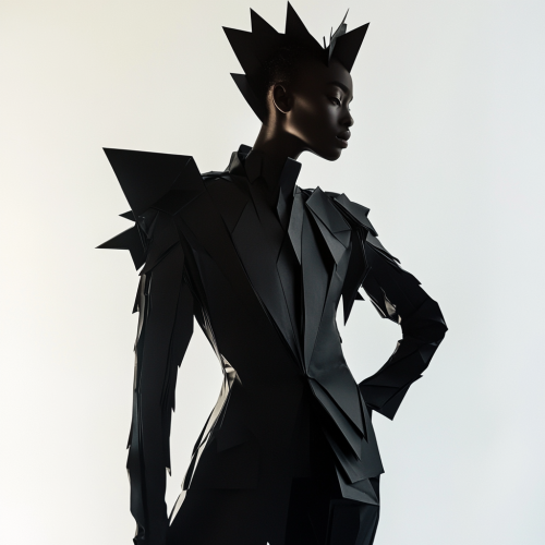 A striking, high-contrast fashion editorial image of a tall, slender model with dark skin and a minimalist, avant-garde aesthetic. The model is wearing a geometric, sculptural black outfit with sharp, jagged edges that cut through the silhouette, creating a bold and abstract shape. The model's pose is dynamic, with one arm slightly bent and the head tilted, exuding a sense of grace and power. The lighting is dramatic and focused, casting sharp shadows that emphasize the texture and structure of the outfit while illuminating the model's glossy skin with a soft, ethereal glow. The background is pure white, providing stark contrast to the deep black of the outfit and the model's silhouette. The model's hair is styled in long, sleek braids that extend upward and outward, adding movement and flow to the composition. The overall mood is futuristic, elegant, and edgy, with a focus on bold shapes and high contrast