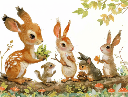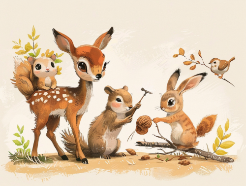 A group of forest animals including a small deer with gentle eyes, a squirrel holding a bundle of nuts, and a little bird perched on a branch. They are all cheerful and ready to help Bunny, each holding tools like tiny hammers, branches, or leaves. --ar 4:3 --v 6.0
