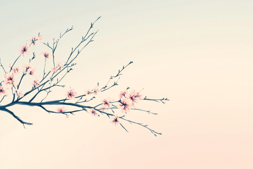 A minimal landscape featuring a blossoming tree branch with delicate pink flowers. The branch stretches gracefully against a soft, serene background with subtle details and gentle gradients. The background is simplified with soft pastel colors, focusing primarily on the beauty of the flowers and the peaceful ambiance. hd quality, minimal and elegant, soft and calming style --ar 3:2 --v 6.1