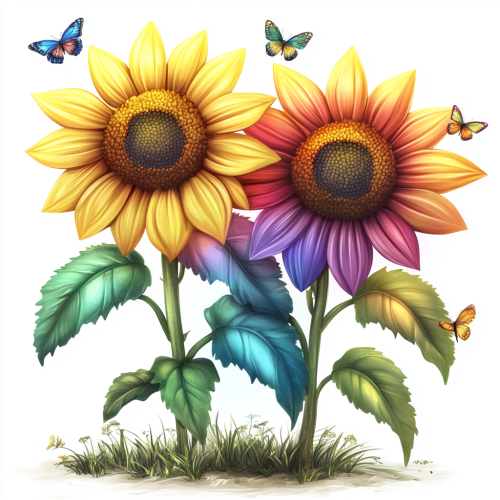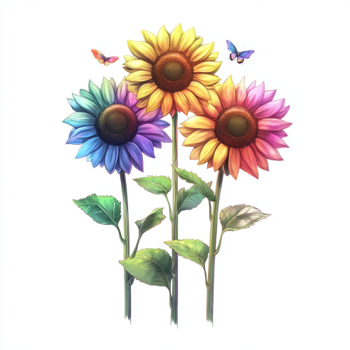 Create Three beautiful realistic sunflowers in LGBTQ COLORS standing next to each other with little distance. the flowers should not overlap, The sunflowers should be in LGBTQ Rainbow Colors. You can add on top of each flower very less butterflys or dragonflies, isolated on white background, very high detailed illustration