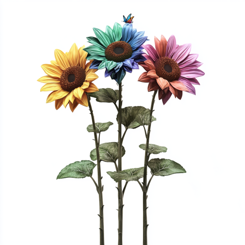 isolated on white background, high detailed, Create Three beautiful realistic sunflowers in LGBTQ COLORS standing next to each other with little distance. The sunflowers should be in LGBTQ Rainbow Colors. The Stem of each flower should be very thin without leaf. You can add on top of each flower very less butterflys or dragonflies