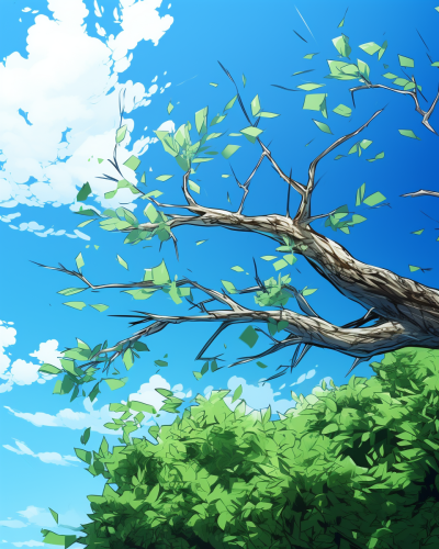 the top of a tree, a single branch, with many leaves, behind the blue sky, low angle shot, anime style --ar 4:5