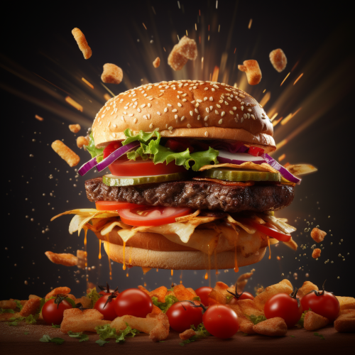 Flying Beef Burger Ingredients Falling and Landing in the Bun, realism