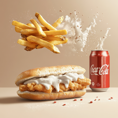 A very realistic side image of a thin, frozen galette sandwich. This sandwich contains pieces of chicken and fried potatoes with white sauce, so that part of the chicken pieces, french fries and white sauce fly over the sandwich in the air, with an artistic advertising design, so that smoke rises from it, and the white sauce appears in a way An advertisement. Next to this sandwich is a box of french fries with ketchup sauce in an advertising manner, and next to them is a can of Coca-Cola that appears in an advertising manner.