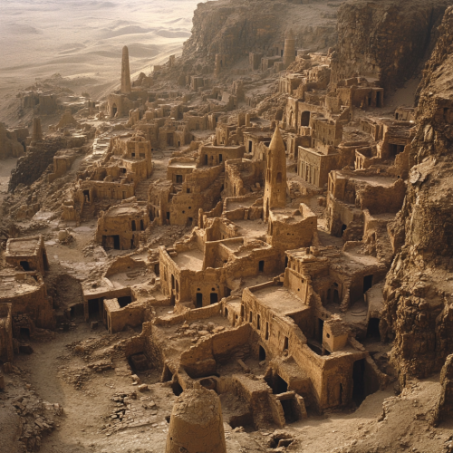 A vast city stretches across a desolate desert landscape, built upon the remains of an ancient cemetery. Massive, weathered tombs resembling early pyramids and mastabas are scattered across the terrain, some transformed into homes or workshops. Mummified remains are preserved in niches within the houses, an everyday sight for the inhabitants. Towering rock-cut tombs dot the surrounding cliffs, their grandeur diminished by the dry, oppressive air. Throughout the city, old sarcophagi serve as tables or storage. The city’s architecture blends ancient stone with makeshift additions, creating a labyrinthine sprawl of alleys and courtyards. The dimness contrasts with the occasional flicker of firelight or shadows moving silently. --v 6.1
