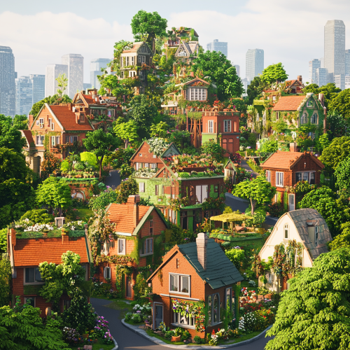 futuristic city in the desert seen from a hill with taller buildings towards the center of town built using mostly copper with turquoise trim and glass windows lightly tinted green with lots of trees in teh streets