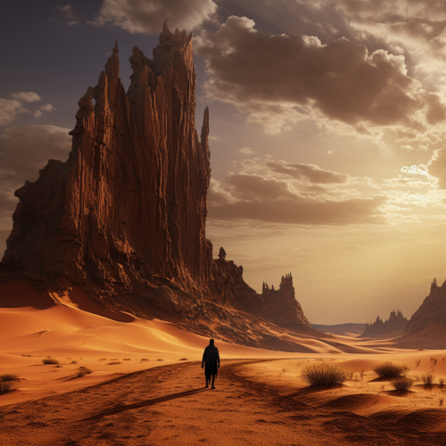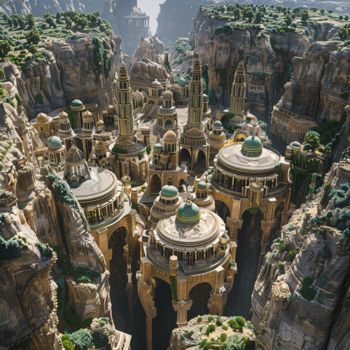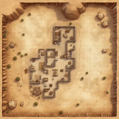 A vast city stretches across a desolate desert landscape, built upon the remains of an ancient cemetery. Massive, weathered tombs resembling early pyramids and mastabas are scattered across the terrain, some transformed into homes or workshops. Mummified remains are preserved in niches within the houses, an everyday sight for the inhabitants. Towering rock-cut tombs dot the surrounding cliffs, their grandeur diminished by the dry, oppressive air. Throughout the city, old sarcophagi serve as tables or storage. The city’s architecture blends ancient stone with makeshift additions, creating a labyrinthine sprawl of alleys and courtyards. The dimness contrasts with the occasional flicker of firelight or shadows moving silently. --v 6.0