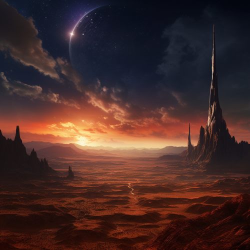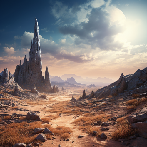 fantasy style, realistic, vast rocky desert valley, with a lone spire in the middle