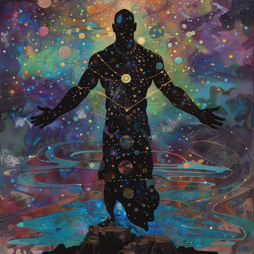 A silhouette of a bald black god in black standing on top of an island, surrounded by stars and galaxies, creating cosmic patterns in his body, set against a backdrop of a starry night sky. Colored pencil sketch, dark fantasy, 2D game art, pastel colors, full-length portrait, tenebrism, detailed background, hyper-detailed --v 6.0