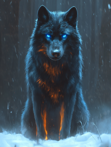 Gothic art-style WHOLE BODY animal design concept of a DARK BLACK wolf with glowing BLACK BLUE FUR, eyes glowing blue, a sloght lowered brow, and serious look, full-body design sheet standing firm, fantasy character, colorful fantasy realism style, 2D game art, shiny/glossy. --v 6.1 --stylize 750 --ar 3:4