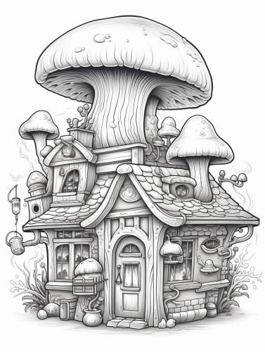 magic mushroom storefront, coloring book page, white background, no shading, clean line art, 2d, no color --ar 3:4
