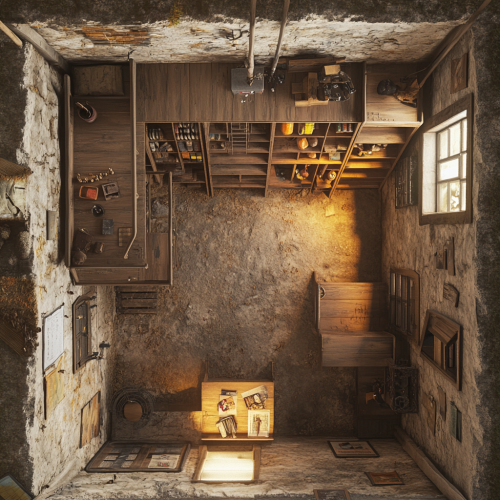 d&d battle map, top down view, the interior or an old house, a small basement with shelves and a ladder up to a hatch, 8k, vivid, 8k ultra detailed, 8k ultra realistic, 8k cinematic, 8k hyper detailed, 8k hyper realistic, 8k photo realistic, 8k insanely detailed, 8k insanely realistic, intricate, high definition, --v 6.1