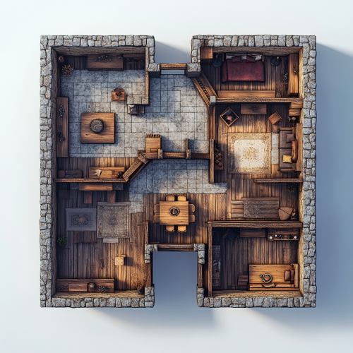 d&d battle map, top down view, the interior or an old 3 room house house with a main central room a small study room a small bedroom and a main entryway, wooden chests scattered throughout, 8k, vivid, 8k ultra detailed, 8k ultra realistic, 8k cinematic, 8k hyper detailed, 8k hyper realistic, 8k photo realistic, 8k insanely detailed, 8k insanely realistic, intricate, high definition, --v 6.1