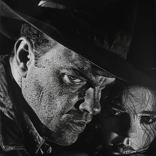A charcoal drawing that looks like a photograph of Orson Welles as a menacing man in large fedora hat who might be a vampire, beautiful woman hanging on to him dramatically, noir style, black and white, semi-realistic, from the radio show The Shadow --s 250 --v 6.0 --style raw