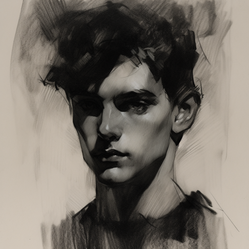 contemporary expressive charcoal drawing of a male face front, looking straight forward, classical realism, poirtait drawing, academic drawing, impressionist, natural tones, black and white --niji 5