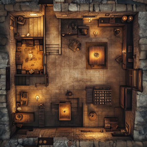 d&d battle map, top down view, the interior or an old house, main floor has an entryway and a man room that has display chests throughout it, one office side room, one small bedroom, a basment with a ladder leading to the main floor, 8k, vivid, 8k ultra detailed, 8k ultra realistic, 8k cinematic, 8k hyper detailed, 8k hyper realistic, 8k photo realistic, 8k insanely detailed, 8k insanely realistic, intricate, high definition, --v 6.1