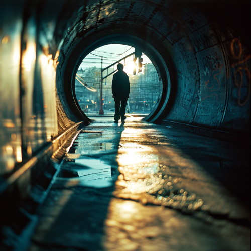 photojournalistic picture of a homeless man's tent with a dog food bowl just outside of it in an alleyway in NYC - HONY style. Inside the tent is a dirty mattress and some magazines. Photojournalistic. Bokeh. Rainy and wet --v 6.0