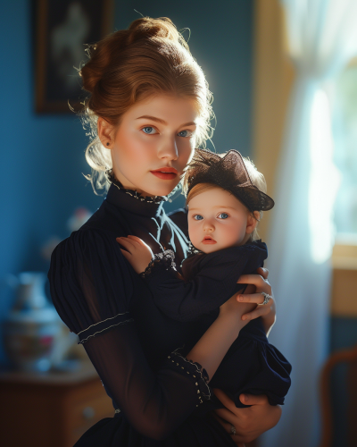 Cinematic, High quality photograph, extremely extremely beautiful young mother joyfully holding new baby in the vibrant sunlight, both mom and baby wearing clothes with navy blue color, navy blue mood, photo-real, hyper-realistic, highly detailed, taken with a sony a1 camera, --ar 4:5 --v 6.0