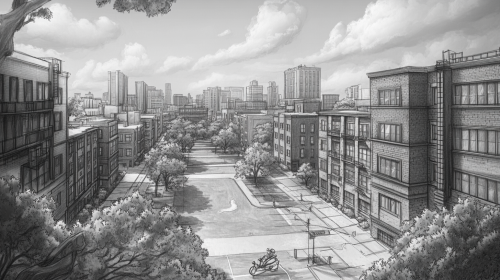 storyboard illustration high shot looking down the street of an inner city neighbourhood block with apartments on the right and a park on the left with large buildings around, concept art, storyboard, black and white, pencil drawing, --ar 16:9 --v 6.1