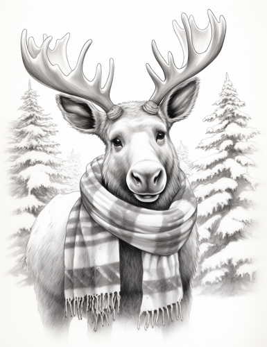 a cartoon pencil sketch, in light gray and white, a pencil character drawing, of an overly cute baby moose wearing a Santa's hat with a pom pom and a plaid Christmas scarf, close-up, snowflakes, snow-covered Christmas trees, snowing, grayscale drawing, minimal shading --ar 100:129