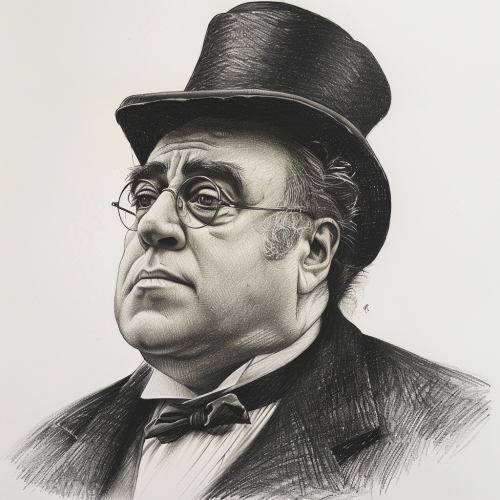 pencil drawing of Danny Devito in a top hat and suit portrait style 1800s
