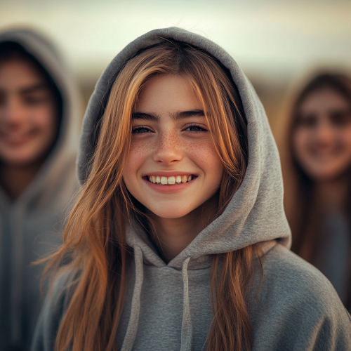 A Group of teenagers around 18. years old. Cute smiling wearing all the same cozy hoodie. The Hood is not on the head. One girl is in the foreground. The Background is blurred.