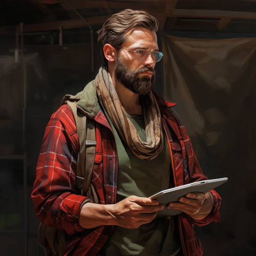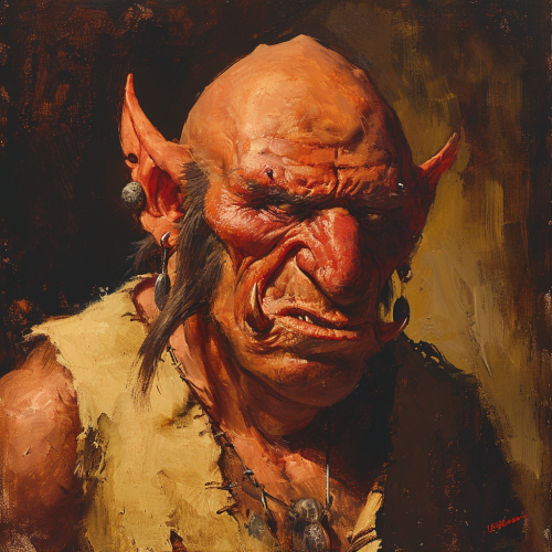 portrait of a Hobgoblin tavern keeper, D&D Hobgoblin, wearing a collarless tatty tunic, bright red skin, bushy sideburns, friendly expression with large tusks, oil painting, Frank Frazetta artwork style, HD, 8K, dramatic lighting, --v 6.0