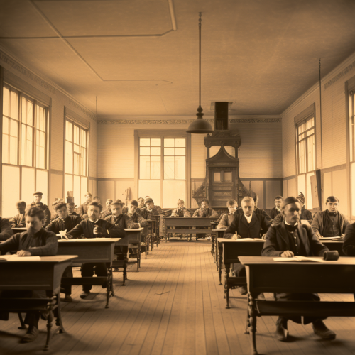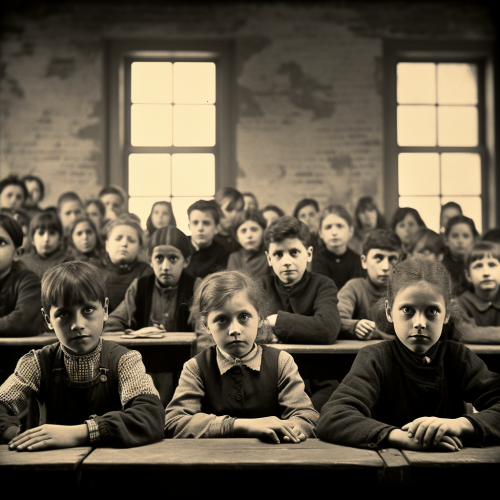 STYLE: photography, | GENRE:1885’s | EMOTION AND COLORS: curious and expressive | SCENE: a classroom from the year 1885. a group of school children seated on their chairs, with their desks arranged in rows facing forward.capturing the children from behind. children should be shown turning their heads to look back at the camera. | TAGS: cinematic framing | CAMERA: RED Dragon Camera 8k | FOCAL LENGTH: | SHOT TYPE: Wide-angle shot, | COMPOSITION:camera should be positioned at the back of the classroom| LOCATION TYPE: classroom | ASPECT RATIO: --ar 1:1