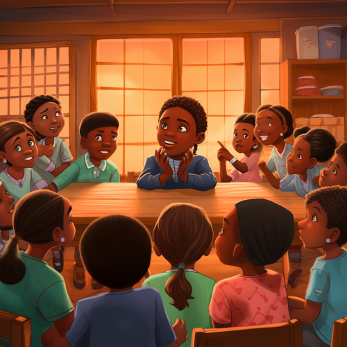 a big class of Guinean children discussing a topic with their teacher. cartoon style