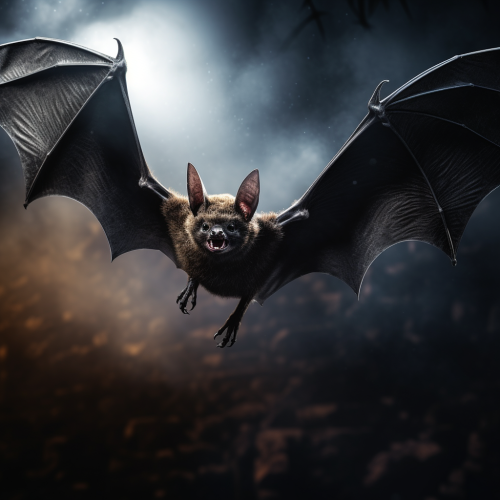 A beautiful vampire who has turned into a black bat with slightly shiny fur. The bat has an elegant yet cute appearance. The fur on her wings shimmers slightly reddish on the edges, giving her a dynamic appearance in flight. On her chest she wears a small golden medallion that also resembles a stylized bat. Fantasy art.