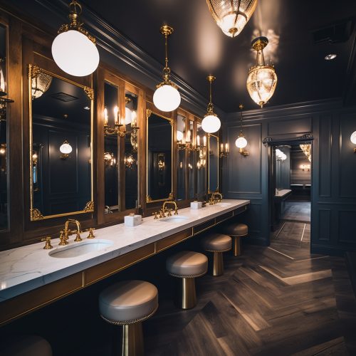 restroom of a very fancy restaurant. 3 gray wooden stalls. Includes a couch to sit on. Fancy light fixture hanging from the ceiling. Big mirror. Three sinks. Dim lighting.