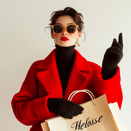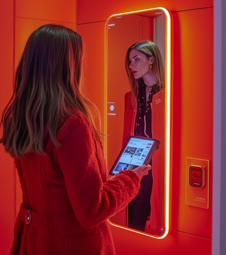Fitting Room of a fast fashion retailer with a mirror on the wall. the main color of the retail brand is red. on the wall there's also an tablet with photos of looks she can make with the selected trying clothes and a button to pay for them. show a beautiful woman trying clothes inside the fitting room. This photo was taken using a Canon EOS R5 camera and a Nikon D800 camera, with professional lighting. --ar 54:61 --q 2 --v 6.1