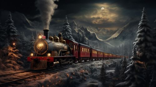 A beautiful winter landscape with a stunning steam locomotive in deep red, emitting realistic smoke from the chimney. The locomotive includes a matching red tender and green passenger carriages. Set in a festive, snowy Christmas scene with a cozy, magical atmosphere. Rendered in high detail with a realistic 3D look. Snow gently falling, pine trees lightly dusted with snow, and subtle Christmas decorations around. Ultra-high resolution. --ar 9:16 --v 5.0 --s 750
