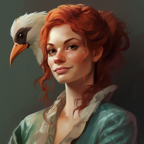 head and shoulders portrait of a goose-themed druid, female, dungeons and dragons, silly look, not pretty, red hair, freckles