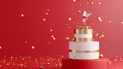 beauty store concept. A Floating gift box and cylindrical beauty product with golden fairies lifting it, magical feeling, clean minimal background, red, white and gold hues, photoreal --v 6.0 --ar 16:9