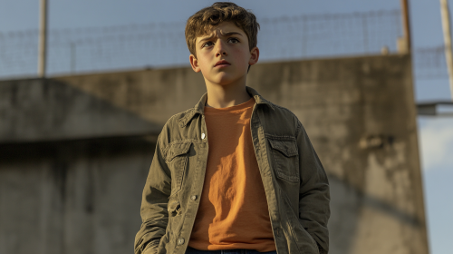 Portrait of A man, straight facing camera, eyes looking at camera likely 32 years old. dressed in simple traveller hoodie. His expression is thoughtful and slightly concerned. The background temperature is unified color warm ocre / beige color with fades.