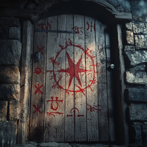 an enormous wide open landscape that resembles a vision of hell. Hellfire a destruction are everywhere. Evil red magical cult symbols are burned into the land everywhere you look giving the feeling of despair and damnation. Highly realistic. Dynamic cinematic shot. In the distance a giant monolithic portal, the gate to hell thrums with magic, stands open looking into another world.