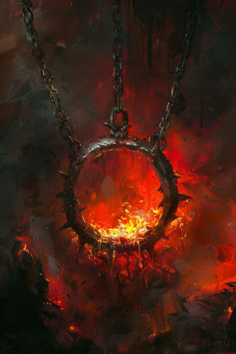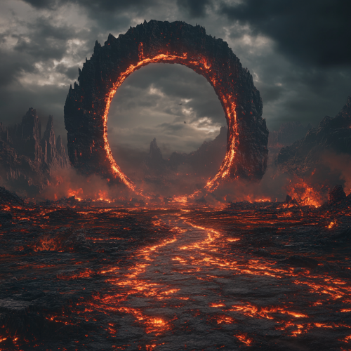 an enormous wide open landscape that resembles a vision of hell. Hellfire a destruction are everywhere. Evil red magical cult symbols are burned into the land everywhere you look giving the feeling of despair and damnation. Highly realistic. Dynamic cinematic shot. In the distance a giant monolithic portal, the gate to hell thrums with magic, stands open looking into another world.