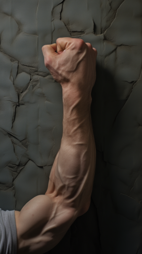 a first-person view of a man's forearm pressed into a wall with a closed fist --ar 9:16
