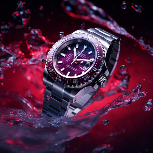 top shot of a translucent Rolex on floating in air with reflective background, digitally outlined galaxy in the background, in style product photography hasselblad 1dx — style raw — s 250 — v 5.2 — ar 9:16