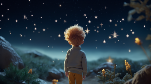 The Little Prince standing under a night sky, looking at the stars with a sad expression. He is thinking about his flower that he left behind. The stars look distant and quiet. Pixar style animation, soft colors, dreamlike atmosphere --ar 16:9 --v 5.2 --style raw
