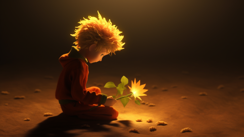 The Little Prince saying goodbye to his flower. He looks conflicted, wanting to stay but needing to leave. The flower glows slightly, as if whispering 'I'll miss you.' Pixar style animation, warm colors, emotional farewell --ar 16:9 --v 5.2 --style raw