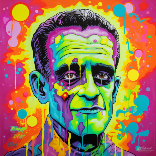 movie classic Frankenstein monster as a skeleton, 80s vapor wave illustration style, sharp & vivid neon colors, dark background, retro 80s punk band poster style, edgy, distressed, 8k --ar 9:16