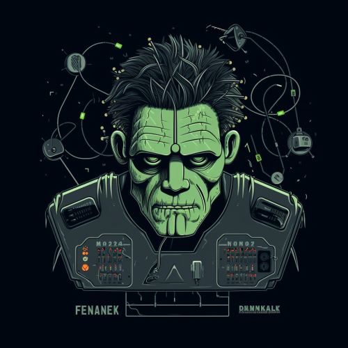 Frankenstein monster being assembled out of bank logos, credit cards and hidden fees, dark background, minimal colors, in the style of minimalist line art