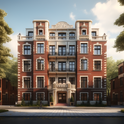 Upscale apartment building with a refined facade, using dark glass panels, polished stone cladding, and detailed metal railings, well-maintained entrance area, emphasizing a sense of exclusivity and a heavy, luxurious feel. Photorealistic, highly detailed, 8K resolution --ar 3:2 --v 6.1 --style raw