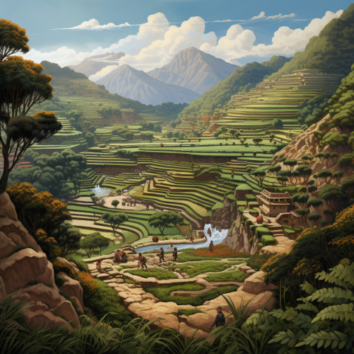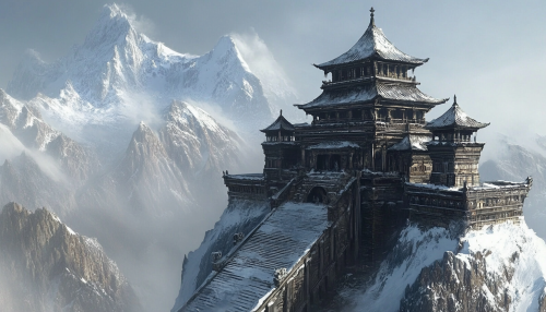 Dungeons and Dragons, Concept art, Dark Fantasy, Haunted Landscape, An Ancient temple with Japanese and Viking influence used for magical training and archives.Temple made of stone with one entrance up long stairs. A few towers that hold rooms with balconies. It sits at the base of a mountain snow on top with a barren valley below --ar 7:4