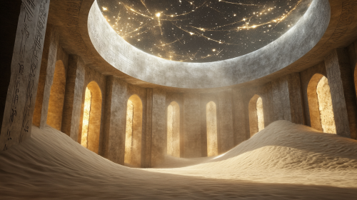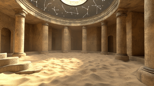 an ancient domed, circular temple room made of stone - no opening in the top of the roof, perfectly smooth - the floor has a thick layer of sand that covers the floor, the walls are smooth and have constellations carved into the stone - hyper realistic --ar 16:9